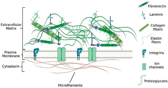 The extracellular matrix (ECM) constitutes a sophisticated three-dimensional supramolecular assembly that confers both biomechanical support and biochemical regulation to resident cells and tissues [] (Figure 2). As the endogenous biological scaffold that envelops and interconnects cellular populations, the ECM serves critical functions beyond structural maintenance, orchestrating cellular behaviors fundamental to embryonic development, tissue homeostasis, wound healing, and regenerative processes []. The ECM comprises a highly organized assemblage of macromolecules, principally categorized into fibrillar proteins, glycosaminoglycans (GAGs), proteoglycans, and matricellular glycoproteins []. These constituents demonstrate tissue-specific heterogeneity in composition and stoichiometry, conferring distinctive biomechanical and biochemical properties tailored to organ-specific functional requirement.