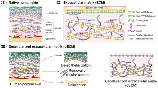 The dermis is one of the most extensively utilized tissues for producing acellular matrix scaffolds due to its structural richness, high collagen content, and favorable mechanical properties []. It provides a dense, fibrous extracellular matrix (ECM) primarily composed of collagen types I and III, along with elastin, fibronectin, and glycosaminoglycans (GAGs), all of which are essential for maintaining tissue integrity and supporting regeneration. These biological components remain largely intact when appropriate decellularization techniques are used, making dermal ECM highly suitable for various clinical applications [].