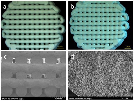 Scaffold design, with cylindrical geometry (9 mm diameter × 2.5 mm height) before sintering (a) and after sintering (b). Structure of the sintered scaffold cross-section at ×40 magnification (c) and ×250 magnification (d).