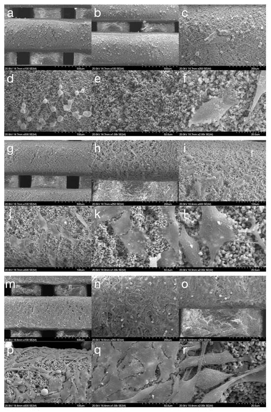Scanning electron microscopy analysis of MG-63 cells co-cultured with HAsint scaffolds. Representative micrographs captured at (a–f) 24 h, (g–l) 72 h, and (m–r) 7 days post-seeding, shown at magnifications ranging from ×50 to ×2000. MG-63 cells demonstrated a progressive morphological adaptation to the scaffold surface, with a distinct transition to spindle-shaped morphology first observed at 72 h post-seeding.