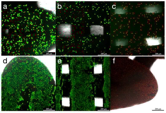 Confocal scanning microscopy imaging of MG-63 cells after LIVE/DEAD® staining, seeded onto HAsint scaffolds after 24 h and 7 days of incubation. (a,b) HAsint scaffolds 24 h after seeding; (c) Negative control HAsint scaffolds 24 h after seeding. (d,e) HAsint scaffolds 7 days after seeding; (f) Negative control HAsint scaffolds 7 days after seeding. Live cells are shown in green and dead cells in red, with a magnification of ×10 (Scale bar, 200 µm).