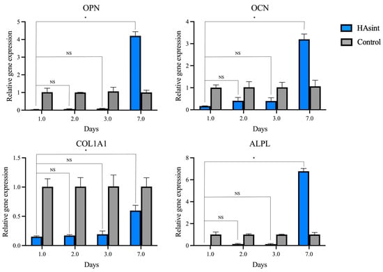 Relative gene expression profiles of osteogenic markers (OPN, OCN, COL1A1, ALPL) in MG-63 cells cultured on HAsint scaffolds, normalized to GADPH and TBP and analyzed by RT-qPCR over 7 days. Well-surface cultured cells served as controls. (OPN: osteopontin; OCN: osteocalcin; COL1A1: type 1 collagen; ALPL: alkaline phosphatase). Asterisks denote significant differences (* p < 0.05, NS no statistical significance).