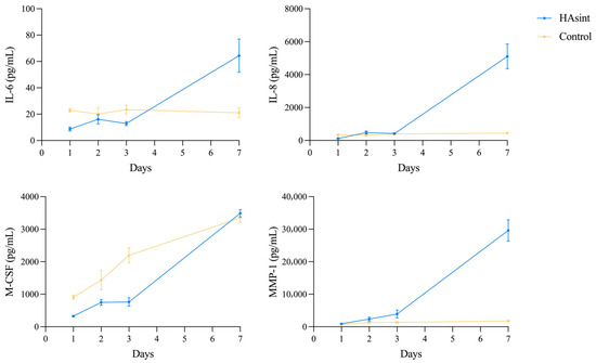 Throughout the 7-day incubation period, all detected analytes in the HAsint group showed a significant increase in secreted concentrations compared to baseline measurements (p < 0.05) and were significantly higher than the controls for IL-6, IL-8, and MMP-1 at the final time point (IL-6: 64.35 pg/mL [SD = 12.57] vs. 21.05 pg/mL [SD = 3.77]; IL-8: 4970.39 pg/mL [SD = 756.44] vs. 444.07 pg/mL [SD = 9.67]; MMP-1: 29,626.07 pg/mL [SD = 3271.42] vs. 1745.65 pg/mL [SD = 254.07]).