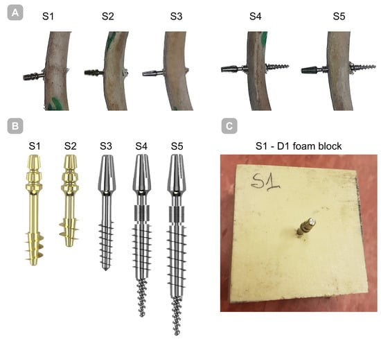 Five titanium (Ti-6Al-4V) implants (BCS, Ihde-Dental GMBH, Munich, Germany) S1–S5 with distinct thread geometries were evaluated—Figure 1. Implants differed in working thread dimensions and guide tip design. Substrates were bovine rib bone specimens prepared to preserve hydration and rigid polyurethane (PU) foam blocks (50 × 50 × 50 mm; Promedicus, Mikołów, Poland; cat. no. 10-9010/10-9015) representing densities D1–D4 per ASTM F1839-08 [19] surrogate classification; block mechanical properties are summarized in Table 1. With densities D1–D4, we refer to four nominal levels of apparent density of the blocks used to simulate spongy bone with rigid polyurethane foam, where D1 is the densest/hardest material and D4 is the rarest/loosest, according to the Misch classification [20].