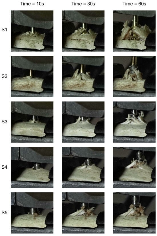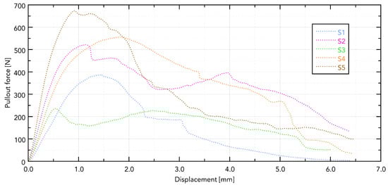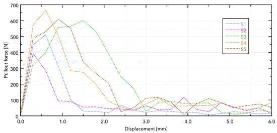 The force–displacement curves for implants S1–S5 extracted from bovine rib bone showed distinct profiles with a single dominant peak followed by a rapid force drop, consistent with a loss of thread engagement (Figure 6).