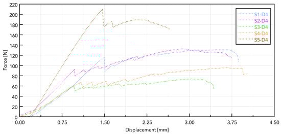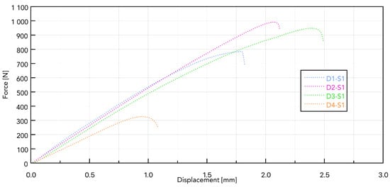 Force–displacement curves for samples D1 to D4 based on the S1 implant.