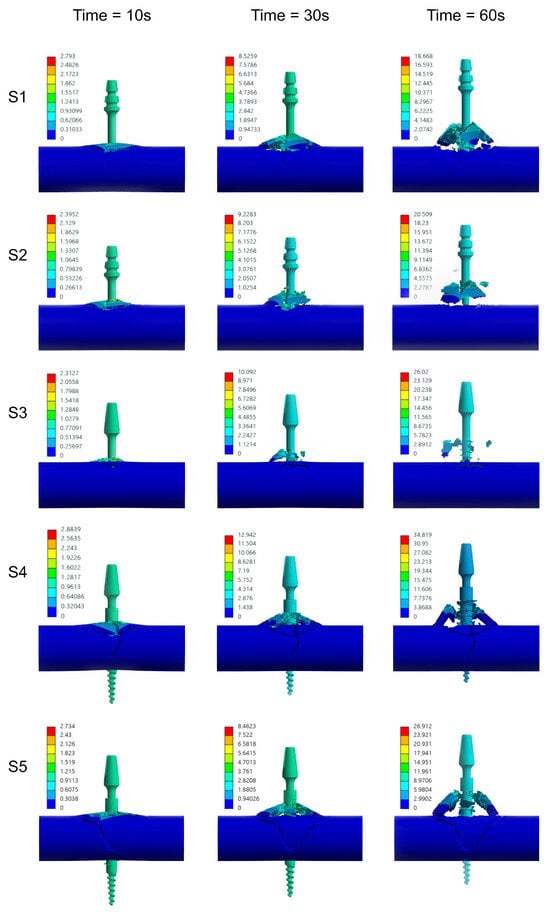 Temporal progression of bone tissue damage in defined time intervals during the implant extraction process—numerical analysis.