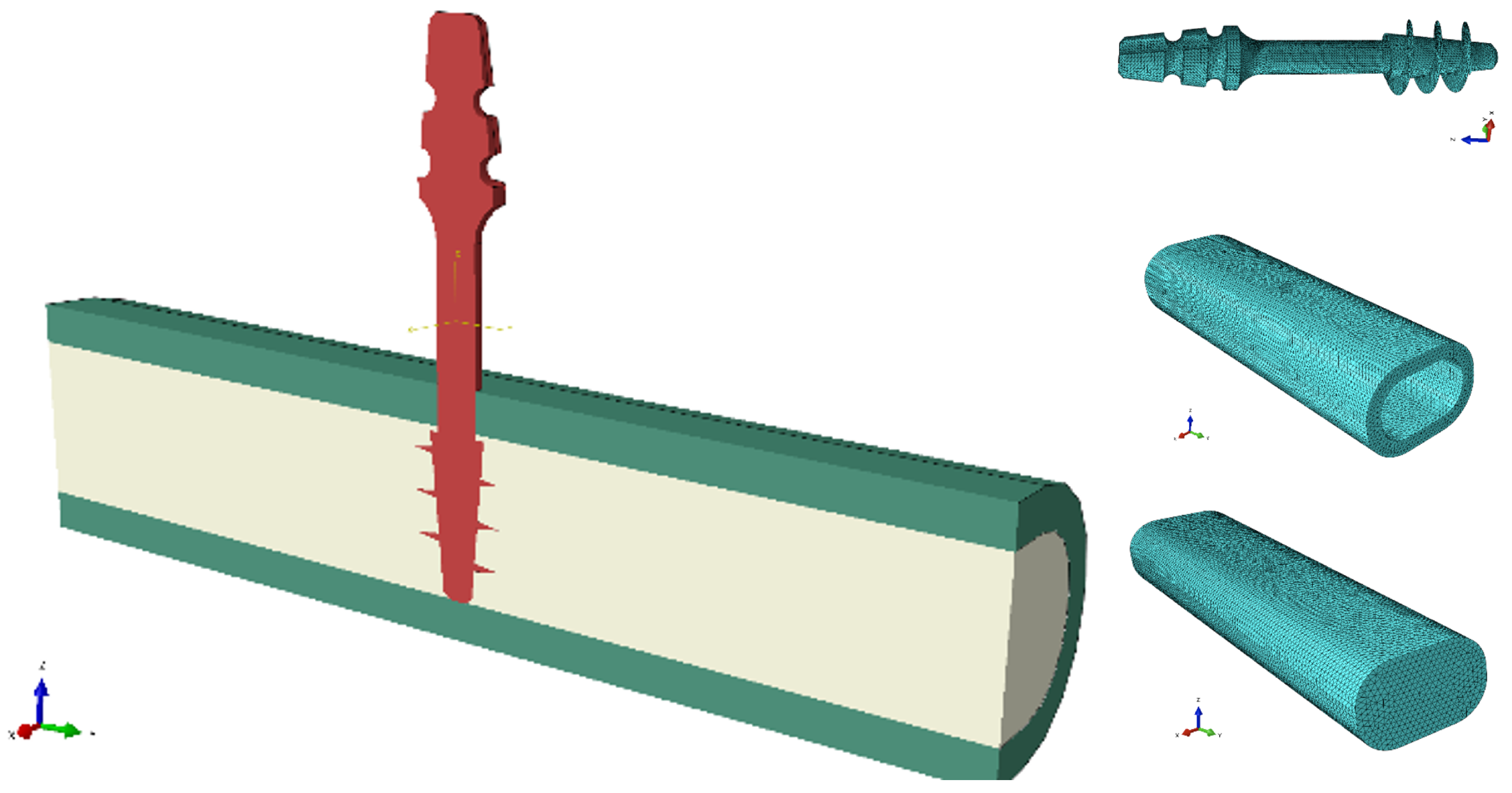 The presented numerical model demonstrates good agreement with the experimental values of maximum pull-out force. However, for sample S3, the observed deviation was significantly greater, largely due to the heterogeneity of the biological material; the bones obtained may have had different microstructures and mechanical parameters despite due care.