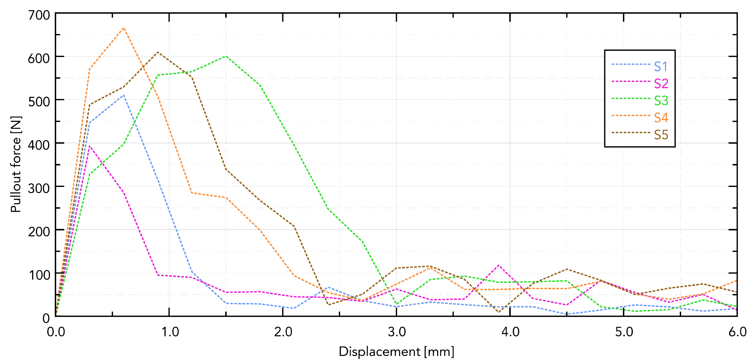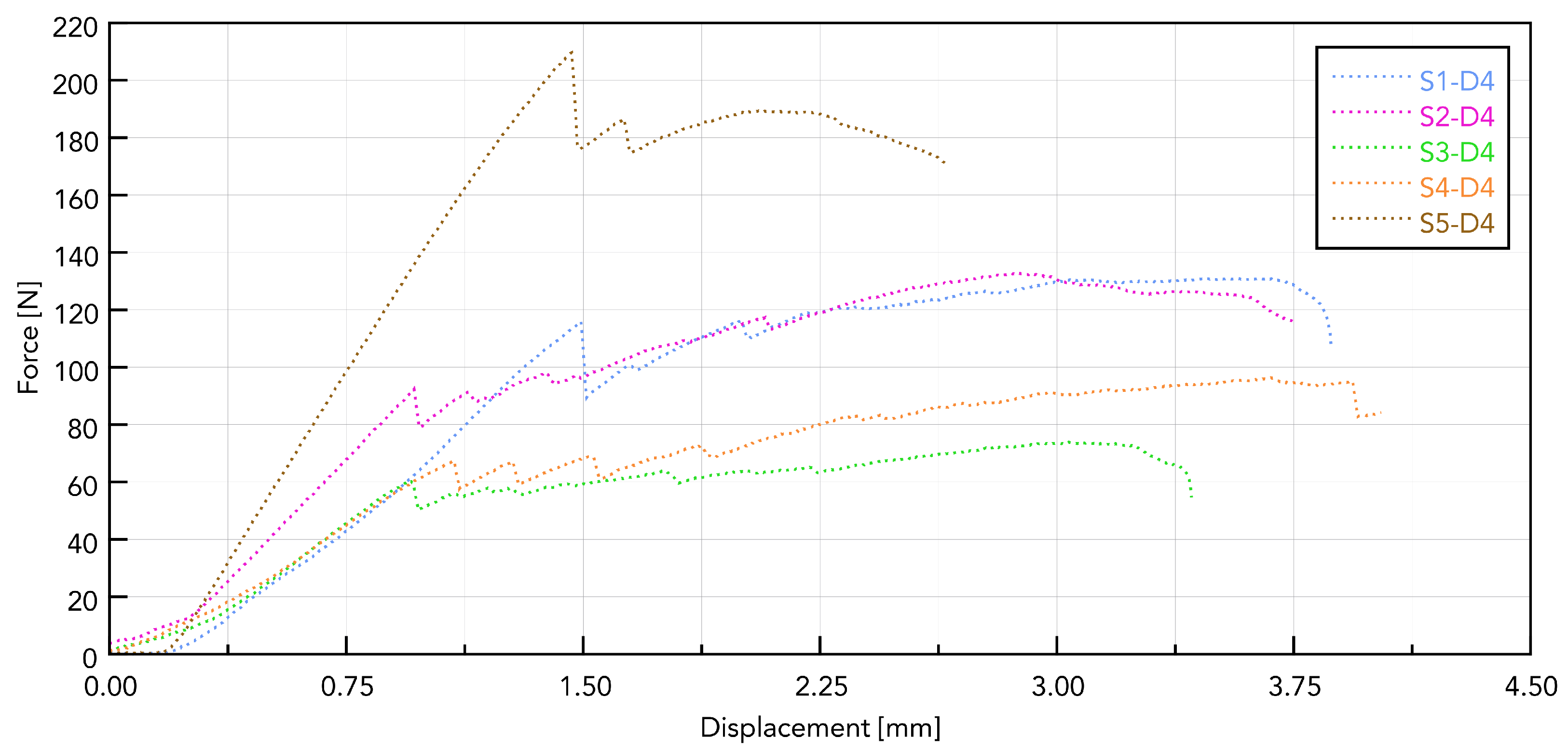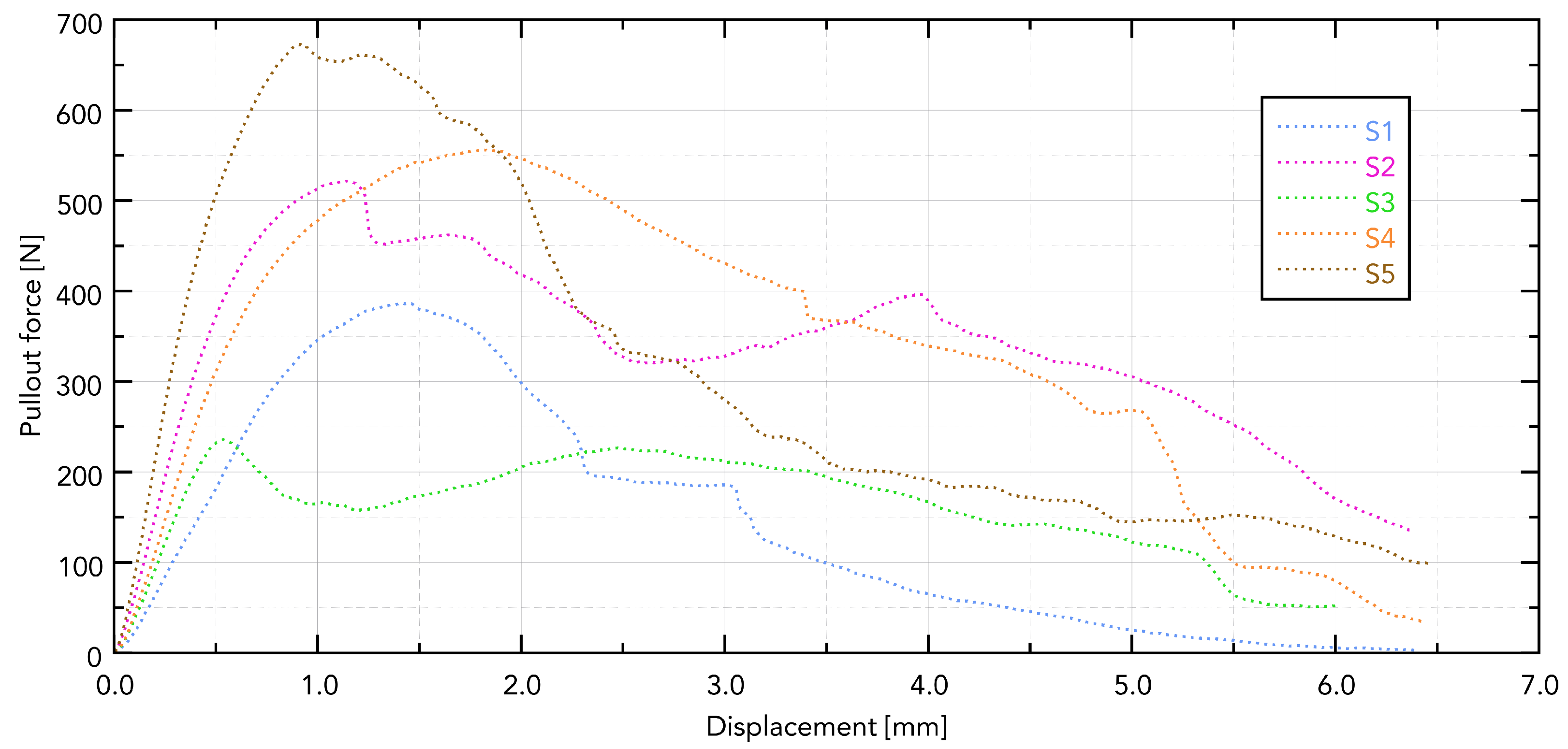 Figure 9 shows a summary for one selected D4 polyurethane foam, which mimics bone structure. The test was conducted for pulling all five types of implants. The presented graph illustrates the force–displacement relationship during the pull-out test of various types of dental implants (labeled S1–S5) carried out using a PU bone block that simulates bone tissue (Promedicus, Mikołów, Poland; cat. no. 10-9010/10-9015). The curves represent different implant types, revealing variations in maximum pull-out force and displacement behavior, indicating differences in mechanical performance between the tested implants. The results demonstrate significant distinctions in force profiles, and some implants achieve higher maximum forces and display different stabilities under similar test conditions. The S5 implant reached the highest maximum force (210 N), characterized by a sharp increase in resistance and a sudden decrease after reaching the peak. The other implants (S1, S2, S3, and S4) generated lower maximum forces (60–140 N), showing a smoother destruction course. The pull-out force was closely related to the diameter, length, and number of thread turns of the implant. A clear relationship was observed, indicating that the larger the diameter and the area of the threads, the greater the pull-out force. The pull-out properties of implants S1, S2, S3, and S4 were very similar, maintaining the above trend. The exceptionally high pull of the S5 implant can be associated with a larger implant area. It should be noted, however, that this study was pilot in nature and that the results obtained are considered to be exploratory.