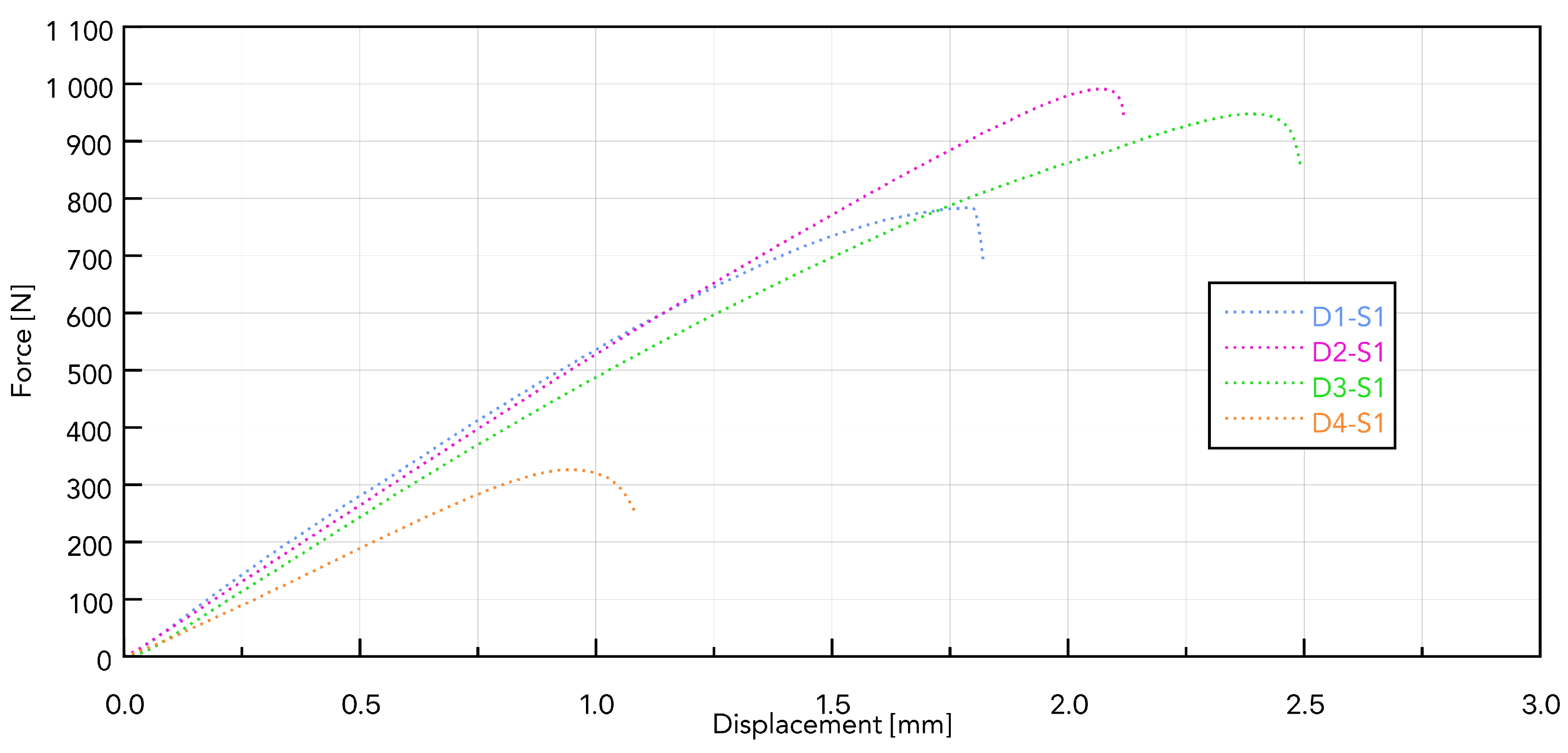 Figure 8, the force–displacement diagram for samples D1 to D4 with the S1 implant shows that the greatest force needed to remove the implant is for sample D2 and is 996.9 N (