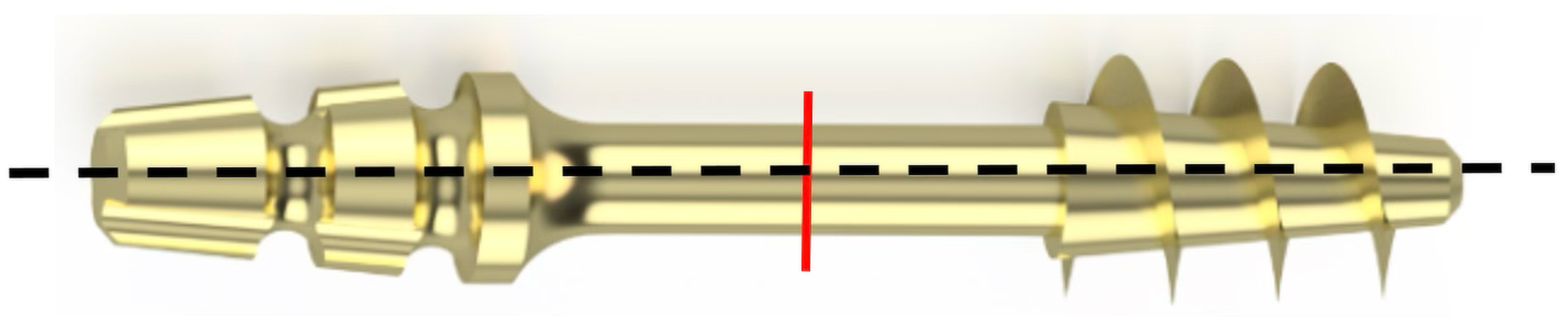Figure 11, showing a typical visible fracture pattern with an initial crack caused by bending the neck of the implant. The observed fractures are characteristic of the generation of cyclic stress within the structure, particularly in the cross-sectional area of the implant. These stresses were induced by bending the implant neck at an angle of up to 30° relative to the longitudinal axis. This simulated the positioning of the implant during a surgical procedure. Each implant test demonstrated durability for a maximum of five such deflections, after which fracture occurred.