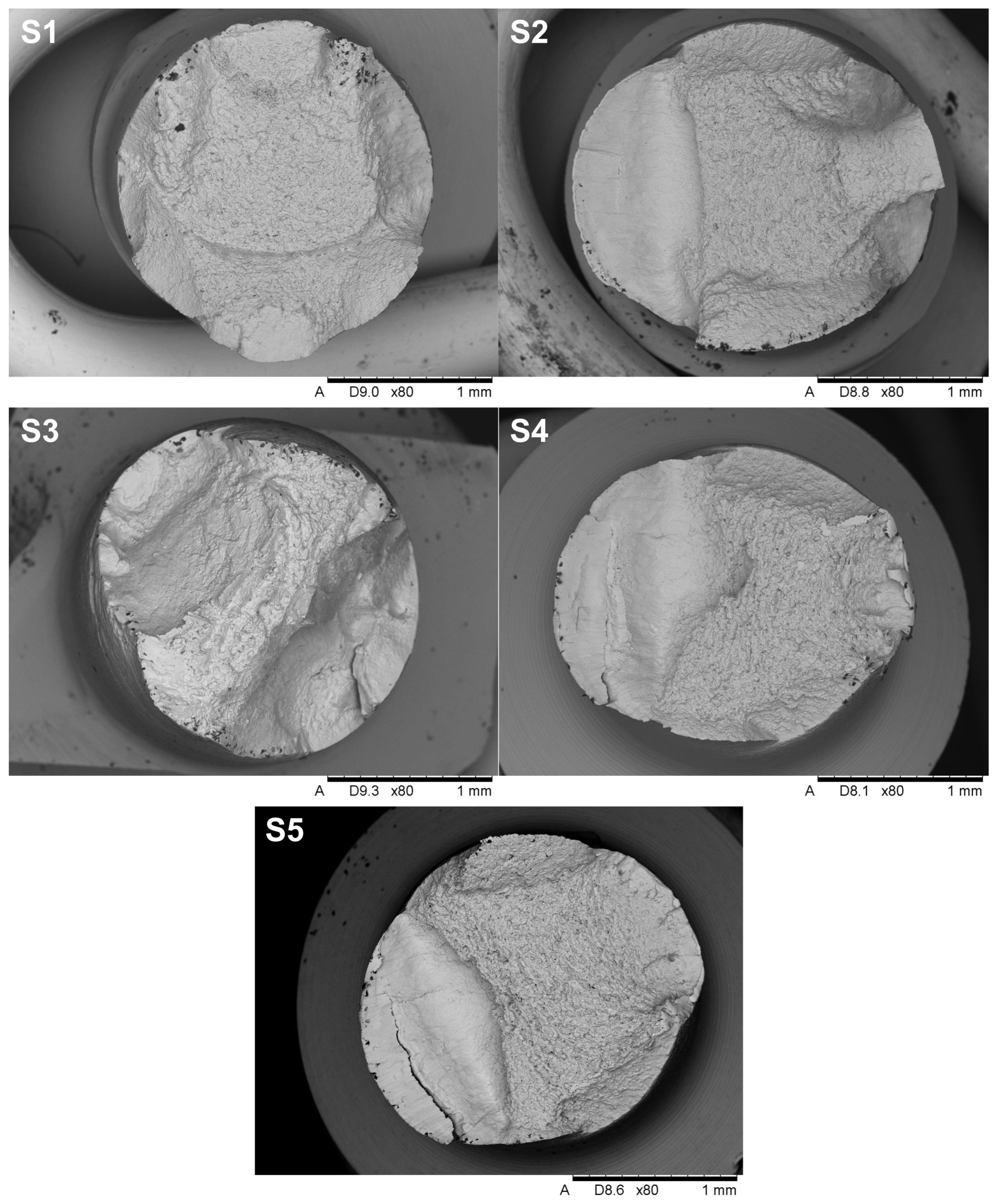 SEM images of the individual implant fracture on the transverse surface in the cervical section are presented in