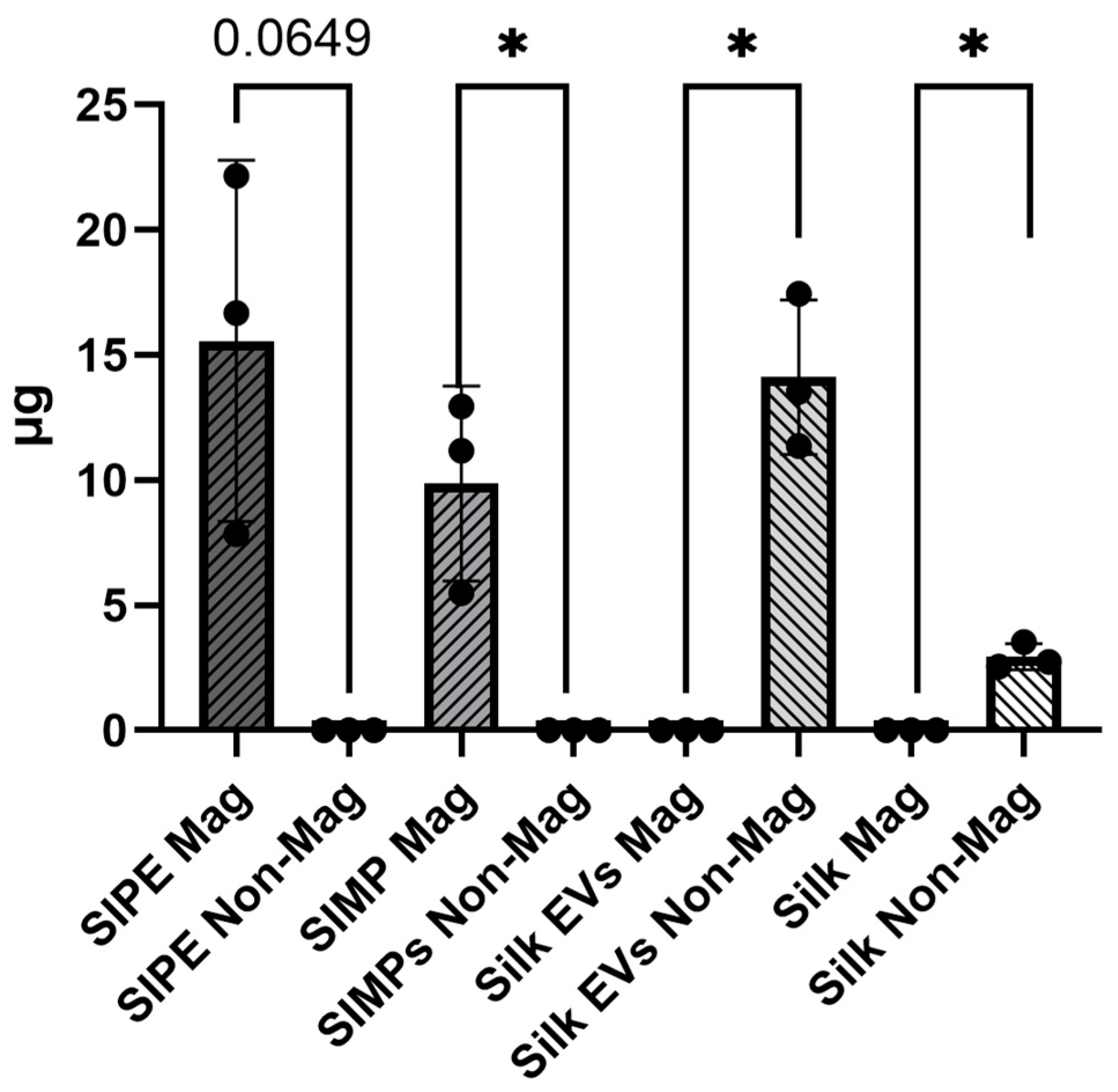 3.3. Magnetic Separation Assay of SIPEs, SIMPs, Silk EV MPs, and Silk MPs