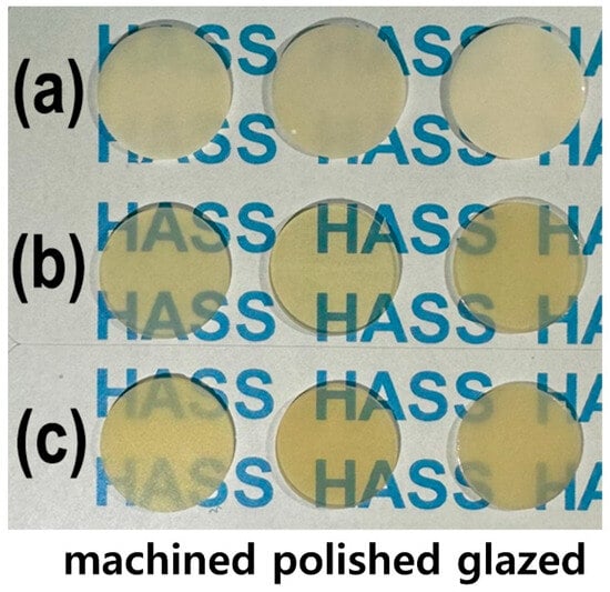 As shown in Figure 1, the LD glass ceramic Amber® Mill (AM) blocks (Hass Co., Ltd., Gangneung, Republic of Korea) and pre-crystallized AC blocks comprised SiO2 (62–75%), Li2O (20–30%), Al2O3 (<5%), P2O5 (1–10%), and other oxides and pigments (0–10%) [2]. After pre-sintering at 750 °C for 40 min, AM was processed and then subjected to secondary sintering at 815–855 °C for 15 min (Figure 1a). AC was subjected to primary crystallization using a single-stage sintering at 840 °C for 15 min. The crystallinity of LD was approximately 60–70% [2], and no additional sintering was required for AC. Fully crystallized 4 mol% Y2O3–stabilized tetragonal ZrO2 polycrystal (4Y–TZP) blocks (Razor 1100) were provided by UNC International Co., Ltd. (Seoul, Republic of Korea). All samples were cut into disc shapes with a diameter and thickness of 12 and 0.6 mm, respectively. The as-prepared disc specimens (as-machined, untreated) were selected as controls. These discs were ground using diamond mesh #230 (HRG–150, AMTechnology, Asan, Chungbuk, Republic of Korea), polished with a 1 μm diamond paste (SPL–15 Grind–X, Okamoto Co., Annaka, Gunma, Japan), and glazed to their final crystallized form, as depicted in Figure 2. Sandblasting samples were prepared by blasting alumina beads (particle size 50 μm) using a dental sandblaster (Basic eco, Renfert GmbH, Hilzingen, Germany) at a pressure of 2–2.5 bar and an angle of 70 degrees, maintaining a distance of approximately 10 mm for 20 s. The polished samples were sandblasted and sonicated, then glazed at 760–800 °C for 1 min using an InSync® stain and glaze paste kit (Jensen Dental, North Haven, CT, USA) [24]. Subsequent cooling occurred at low temperatures to prevent the induction of failure from occurring on the surface.