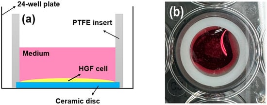 Following culturing for 72 h, the proliferative activity of the cells (n = 5) was investigated using a live/dead assay kit (Thermo Fisher Scientific, Waltham, MA, USA) [26,27,28]. Cell seeding (2 × 104 cells/well) was performed using an efficient seal (cylindrical polytetrafluoroethylene (PTFE) insert: 2 mm thick, 15.5 mm high, 15 mm in diameter) around the ceramic disc. This approach is reliable for investigating the behavior of rigid biomaterials [26,27,28,30,31]. The HGF-1 cells were easily fixed onto a sample disc, and cell proliferation and spreading were evaluated [31]. Green indicated living cells, while red indicated dead cells [26,27,28]. As shown in Figure 3, a bevel with a height and thickness of 1 mm each was prepared from the bottom of the cylinder and fixed to the disc sample with a light frictional force. The disk insert system was applied to a 24-well plate [31]. After removing the PTFE insert from the disc, viable and dead HGF-1 cells were stained according to the manufacturer’s instructions and visualized using a fluorescence microscope (DP73; Olympus, Tokyo, Japan) [26,27,28,30,31].