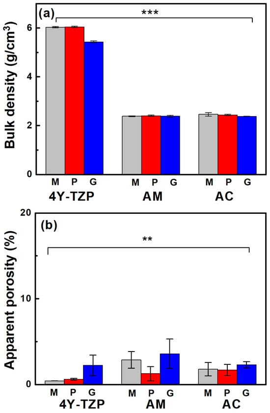 (a) Bulk density and (b) apparent porosity of various samples. M, P, and G represent machined, polished, and glazed, respectively. Statistical significance is indicated by ** (p < 0.01) and *** (p < 0.001).