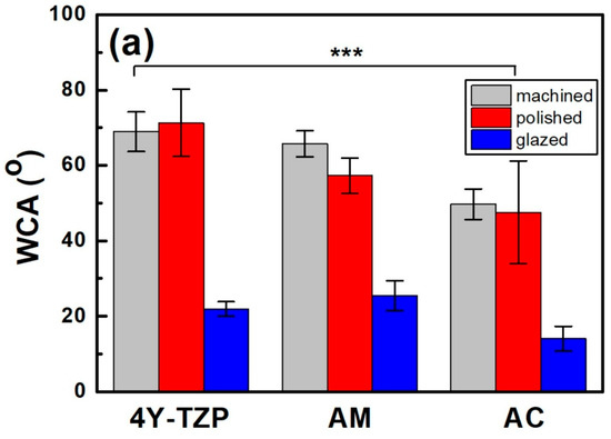 After polishing, the WCA of 4Y–TZP increased from 68.9° to 71.3°, indicating a slight increase in hydrophobicity (Figure 5a). However, when 4Y–TZP was glazed, the WCA dramatically decreased to 21.9°, implying that the hydrophilicity of 4Y–TZP was significantly enhanced [15,16,24,34,35,36]. Thus, surface treatment had a significant effect on the WCA of ZrO2 and LD glass ceramics (p < 0.001). The WCA was influenced by material type (, p < 0.001) and surface condition (, p < 0.001; Figure 5a) but not by the interaction between material type and surface condition (, p = 0.073). Polished 4Y–TZP had the highest WCA (71.3°) and lowest roughness. The difference in the WCA between machining and polishing was not significant (p = 0.536); however, polished ceramics (4Y–TZP, AM, and AC) exhibited different WCAs. Representing the hydrophilicity index, the WCA of 4Y–TZP decreased in the following order: polishing, machining, and glazing. However, LD exhibited a WCA decrease in the order of machining, polishing, and glazing [33]. The WCA of the AM samples gradually decreased from 62.8°, 56.6°, and 25.4° as the samples were machined, polished, and glazed, respectively. Moreover, the polished 4Y–TZP exhibited the highest WCA, whereas glazed AC had the lowest WCA. As shown in Figure 5, all samples showed similar results, with a dramatic decrease in WCA after glaze treatment.