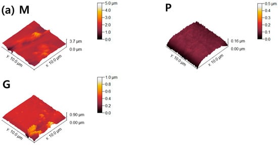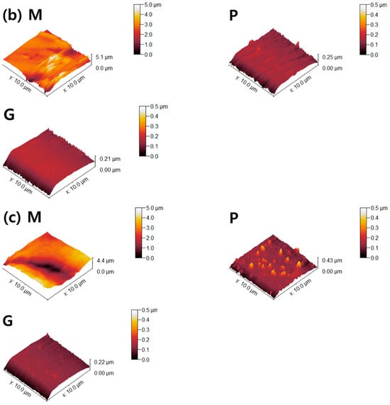 AFM topographies of (a) 4Y-TZP, (b) AM, and (c) AC ceramics. M, P, and G represent machining, polishing, and glazing, respectively.