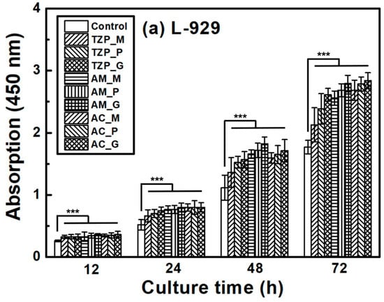 The L–929 and HGF-1 cell proliferation results are presented in Figure 7, which shows that the cells were well attached to the ceramics and proliferated over time. The null hypothesis that surface treatments do not affect the cell proliferation of ZrO2 and LD glass ceramics was rejected (p < 0.001). Despite differences in surface condition, no significant differences in L–929 cell proliferation were observed up to 12 h after cell culture. After 24 h, the growth rate of the LD ceramics began to slightly change compared with that of ZrO2. The proliferation rates of the ceramics increased in the order of 4Y–TZP, AM, and AC after 72 h of culture. The proliferation of HGF-1 cells was also examined. Similarly to L–929 cells, HGF-1 cells showed no significant differences in proliferation across the different surface conditions during culture for up to 24 h. The growth rates of the glazed samples were significantly superior, and glazed LD samples grew faster than glazed 4Y-TZP samples. When glazed LD samples were cultured for 72 h, HGF-1 proliferation dramatically increased (Figure 7b).