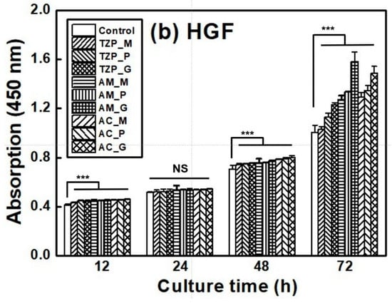 Proliferation of (a) L–929 and (b) HGF-1 cells on the negative control, 4Y–TZP, AM, and AC ceramics over time. Statistical significance is indicated by *** (p < 0.001). The horizontal line (NS) indicates not statistically significant (p > 0.05). Note: M, P, and G represent machining, polishing, and glazing, respectively.