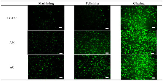 Live/dead assays of HGF-1 cells seeded onto various 4Y–TZP, AM, and AC ceramics. Note: scale bar is 300 μm.