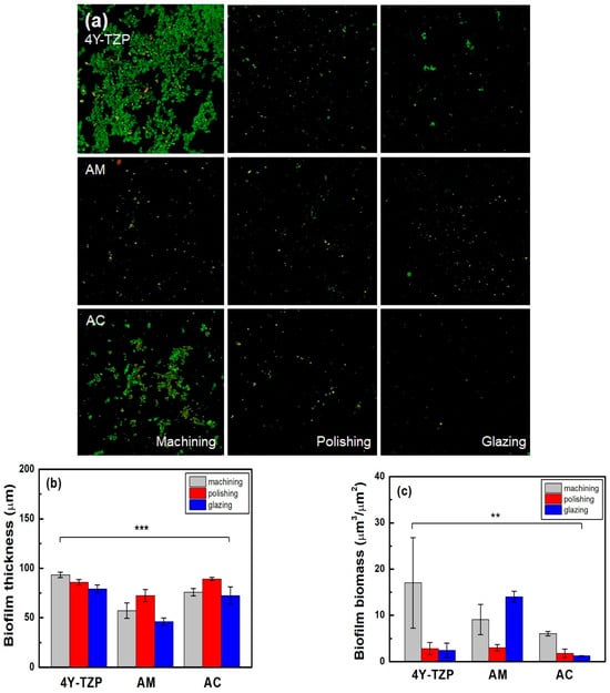 The number of viable bacteria attached to 4Y-TZP, AM, and AC stained with green fluorescent dye was higher in the machined group than in the other groups (Table 2 and Figure 9a). As shown in Figure 9b, the lowest biofilm thickness was observed in all glazed samples. Subsequently, quantitative analyses were performed using biofilm biomass. The null hypothesis that surface treatments do not affect the biofilm biomass of ZrO2 and LD glass ceramics was rejected (p < 0.01). For glazed AM, higher biomass values of the biofilms were observed. Thus, because all specimens were polished, the biomass of the biofilm decreased (Figure 9c). Overall, the glazed 4Y–TZP and AC samples showed a significant bacterial inhibition effect compared to the other groups [20,21,22,23,32].