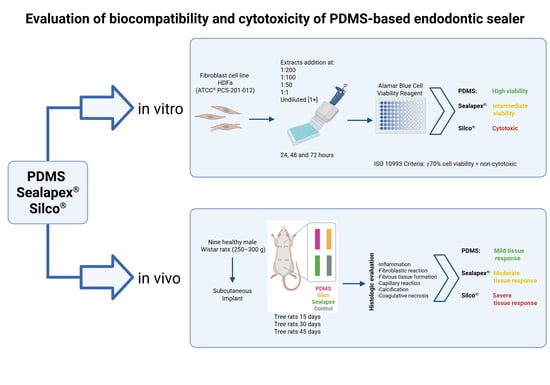 - Santos, J.M.; Pereira, S.; Sequeira, D.B.; Messias, A.L.; Martins, J.B.; Cunha, H.; Palma, P.J.; Santos, A.C. Biocompatibility of a bioceramic silicone-based sealer in subcutaneous tissue. J. Oral Sci. 2019, 61, 171–177. [Google Scholar] [CrossRef] [PubMed]