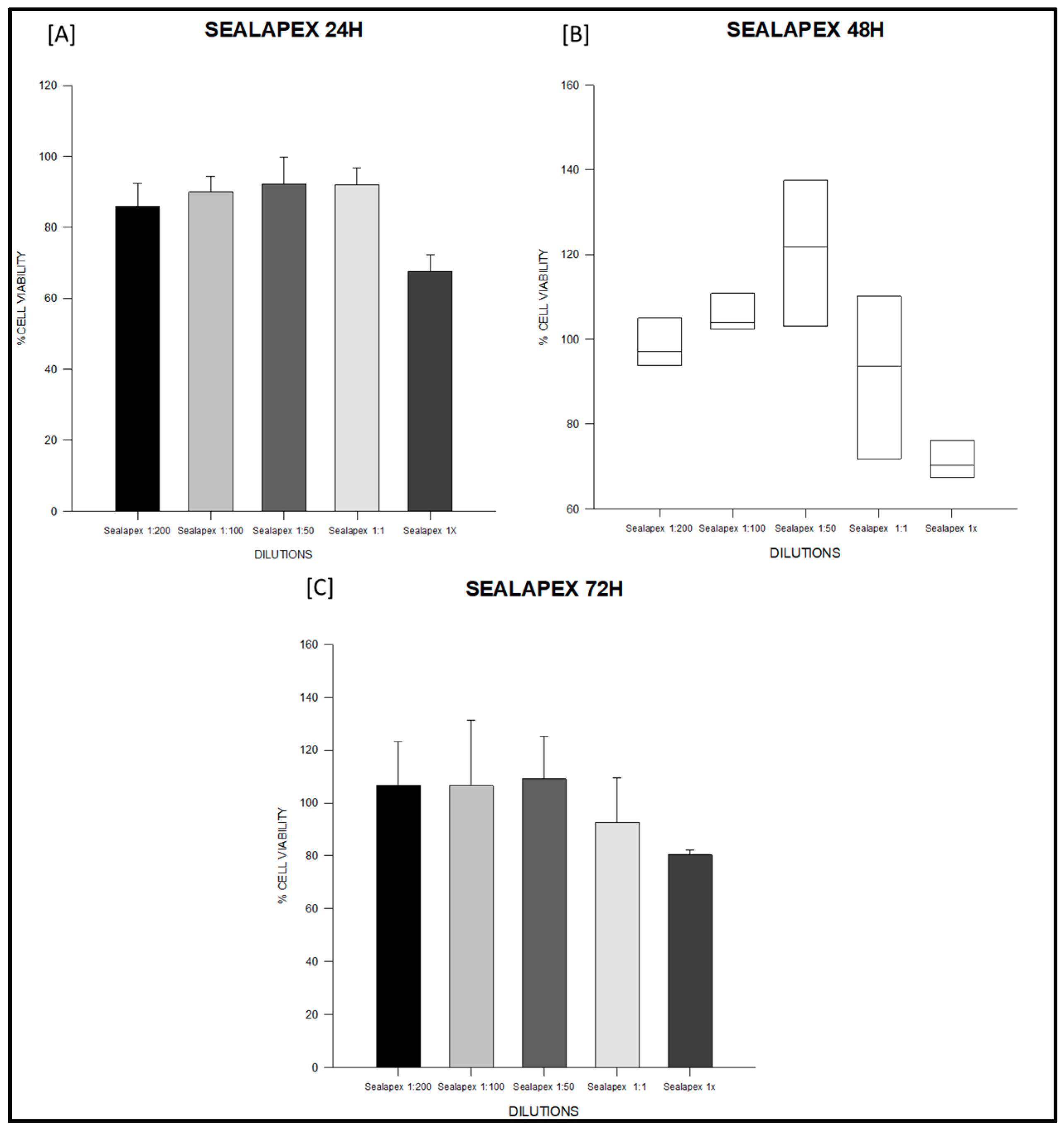 | Sealapex | 24 h | 3 | 85.90 ± 6.54 | 90.01 ± 4.35 | 92.14 ± 7.58 | 92.07 ± 4.61 | 67.54 ± 4.79 |