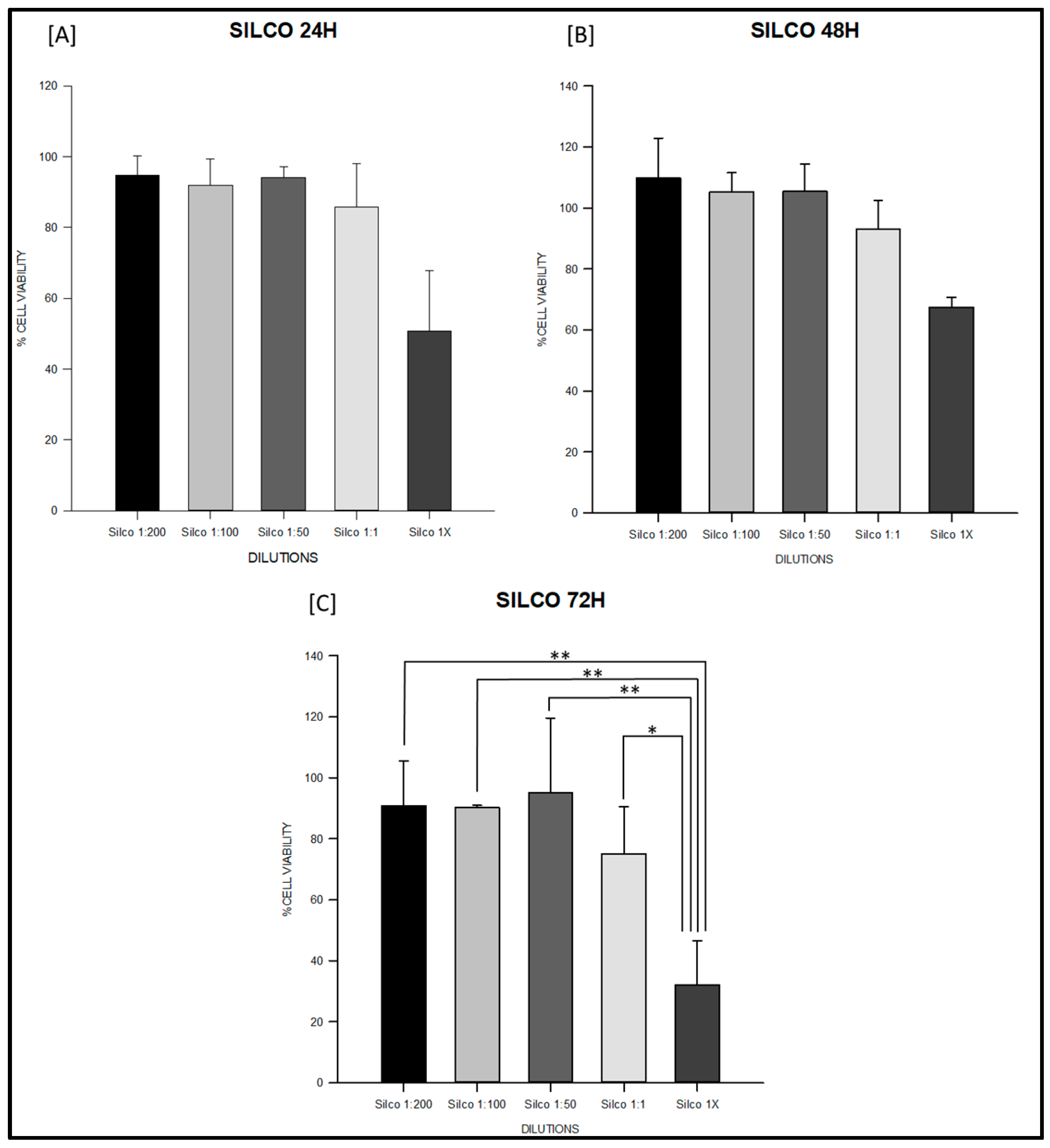 | Silco | 24 h | 3 | 94.81 ± 5.27 | 91.93 ± 7.32 | 94.05 ± 2.99 | 85.66 ± 12.24 | 50.67 ± 17.16 |