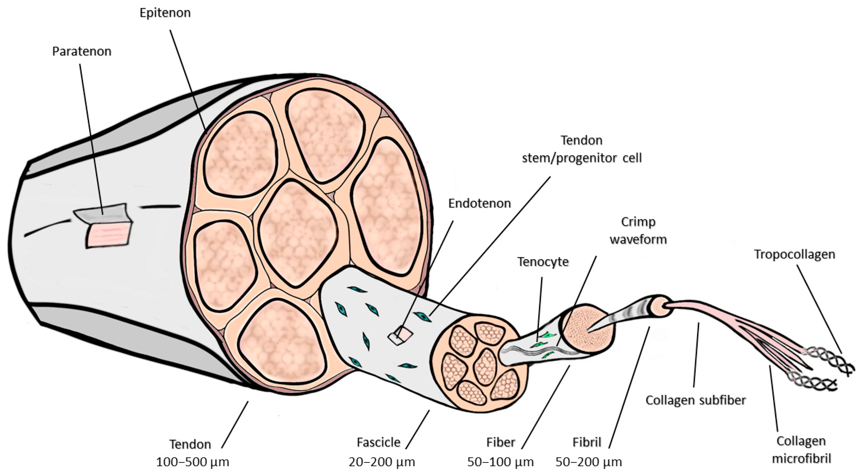 - Karimi, H.; Seyed-Forootan, K.; Karimi, A.-M. Stem Cells and Tendon Regeneration. In Regenerative Medicine and Plastic Surgery: Skin and Soft Tissue, Bone, Cartilage, Muscle, Tendon and Nerves; Springer International Publishing: Cham, Switzerland, 2019; pp. 369–384. [Google Scholar] [CrossRef]