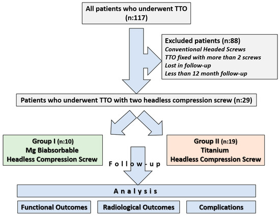 Ethical approval for the study was obtained from the institutional review board prior to its initiation, and informed consent was obtained from all participants (Approval date and issue: 3 September 2025). The study was conducted in accordance with the principles outlined in the Declaration of Helsinki. All patients who underwent tibial tubercle osteotomy between 2013 and 2023 were retrospectively reviewed using the institutional database. 117 patients who underwent Fulkerson osteotomy during this period were identified. In our department, Fulkerson osteotomy is generally stabilized with either two or three screws, depending on the surgeon’s preference. Among the identified patients, 10 who underwent fixation with Mg bioabsorbable headless compression screws, each treated with two screws, were selected for the study group. To avoid potential bias associated with screw number and design, and to ensure group homogeneity, the Ti group was likewise restricted to patients fixed with two headless compression screws. Thus, a study cohort was constituted in which both the Ti and Mg groups consisted exclusively of patients fixed with two headless compression screws (Two Mg screws versus two Ti screws). The exclusion criteria were as follows: use of conventional headed screws, use of more than two screws for fixation, follow-up duration of less than one year, incomplete clinical or radiological data, insufficient documentation, or loss to follow-up. Since the Mg group consisted of only 10 patients, it was necessary to confirm whether the available sample size would be sufficient to draw reliable conclusions. The sample size calculation was conducted to determine the required sample size for the comparative group using the G*Power software (version 3.1.9.7) [21]. The primary outcome was the comparison of implant removal rates between two different screw types: bioabsorbable and metallic. Based on previously published data, the implant removal rate was estimated to be 0% for bioabsorbable screws and approximately 49% for metallic screws used in Fulkerson TTO [9,20]. Given this expected substantial difference, a one-sided test was employed with a significance level (α) of 0.05 and a statistical power (1 − β) of 80%. Due to the limited number of patients in the bioabsorbable screw group, the allocation ratio was set at 2:1 in favor of the metallic screw group to enhance the statistical power. Under these assumptions, a minimum total of 20 patients (7 in the bioabsorbable screw group and 13 in the metallic screw group) was required to achieve sufficient power. After applying the exclusion criteria, a total of 29 patients were included in the study: 10 patients in the magnesium screw (Mg) group and 19 patients in the titanium screw (Ti) group (Figure 1).