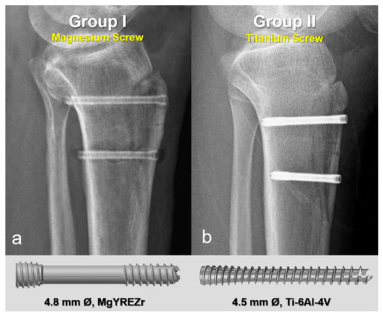 Representative postoperative radiographs and screw models used in each group. (a) Magnesium bioabsorbable screw (4.8 mm Ø, MAGNEZIX® CSc, Syntellix AG, Hanover, Germany), featuring a headless, cannulated, Herbert-type design with variable pitch threading for self-compression and complete subcortical embedding. (b) Titanium headless compression screw (4.5 mm Ø), with a conical, cannulated, variable pitch design.