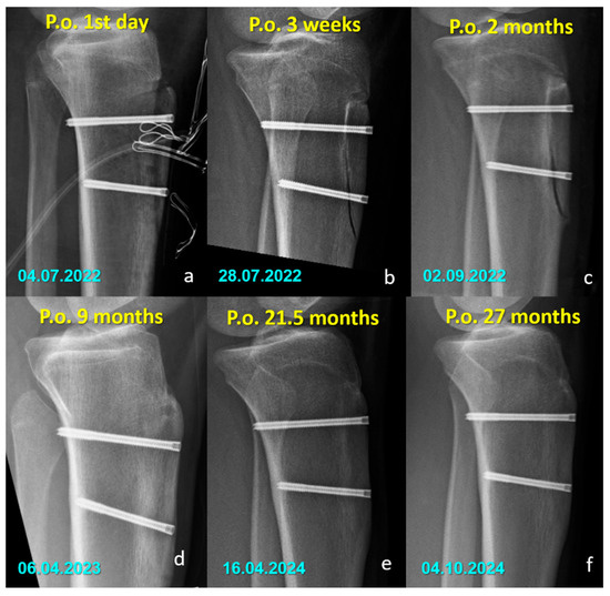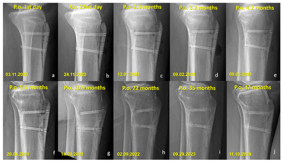 Sequential lateral radiographs of a patient who underwent Fulkerson osteotomy fixed with bioabsorbable Mg screws, showing the typical radiographic evolution over a 47-month follow-up period. (a–e) In the early postoperative period, radiolucent areas around the screws are visible, consistent with hydrogen gas release during magnesium degradation. (f–h) Progressive changes indicate gradual absorption of the screws, with a noticeable decrease in screw density and partial loss of structural integrity over time. (i,j) Despite ongoing degradation, remnants of the screw material remain visible at 35 and 47 months, indicating incomplete resorption. No complications such as osteolysis, displacement, or nonunion are observed throughout the follow-up.