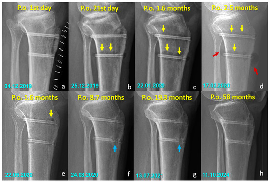 Serial radiographs demonstrating the temporal changes associated with magnesium screw degradation following Fulkerson osteotomy. (a–d) Early postoperative images show radiolucent zones and intramedullary or soft tissue gas shadows (yellow arrows), indicating hydrogen release during magnesium corrosion. In (d), gas accumulation is evident in the adjacent soft tissues (red arrows). (e) By 5.6 months, early signs of material degradation appear. (f–h) In the later stages, blue arrows highlight the loss of screw integrity, particularly along the osteotomy line, reflecting ongoing degradation and fragmentation of the implant. At 58 months (h), radiodense remnants of the screw are still visible, indicating that complete bioabsorption was not achieved in this case. (Arrow color code, yellow = radiolucent zones/gas shadows, red = soft tissue gas accumulation, blue = loss of screw integrity).