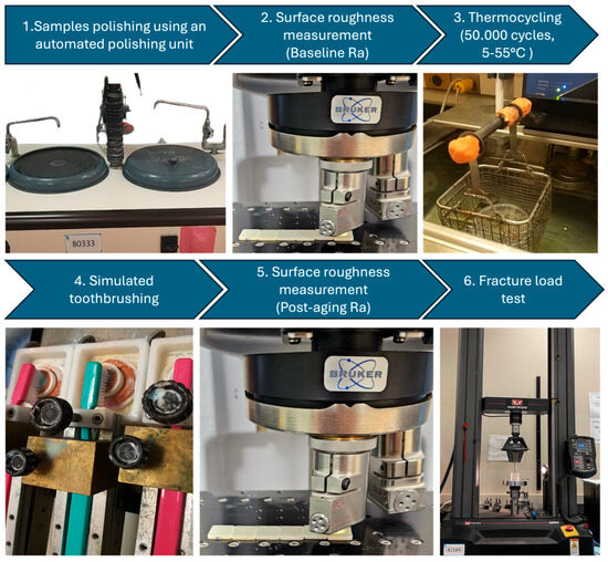 An image showing the different steps of the in vitro investigation, starting with polishing of the ceramic samples, baseline surface roughness measurements followed by thermocycling and simulated toothbrushing, then post-aging surface roughness measurements and fracture resistance.