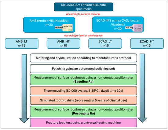 Following crystallization, all disks were polished with a fully automated polishing unit (Automata, Ried, Germany) using standardized sequential abrasive protocols. Subsequently, they were ultrasonically cleaned in deionized water to remove residual debris and surface contaminants prior to testing.