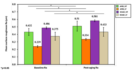 Thermocycling and simulated toothbrushing resulted in a statistically significant increase in surface roughness across all groups (p ≤ 0.05), with all materials showing higher roughness values after thermocycling (Figure 3).