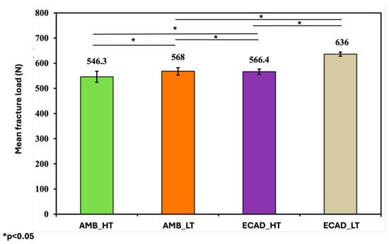 Regarding fracture resistance, AMB_LT demonstrated significantly higher values (568 ± 14.73 N) than AMB_HT (546.3 ± 21.90 N). ECAD_LT exhibited the highest fracture resistance (636 ± 8.29 N), followed by ECAD_HT (566.4 ± 10.65 N), both of which were significantly higher than their AMB counterparts. The overall trend in fracture resistance was ECAD_LT followed by ECAD_HT, AMB_LT and AMB_HT (Table 4).