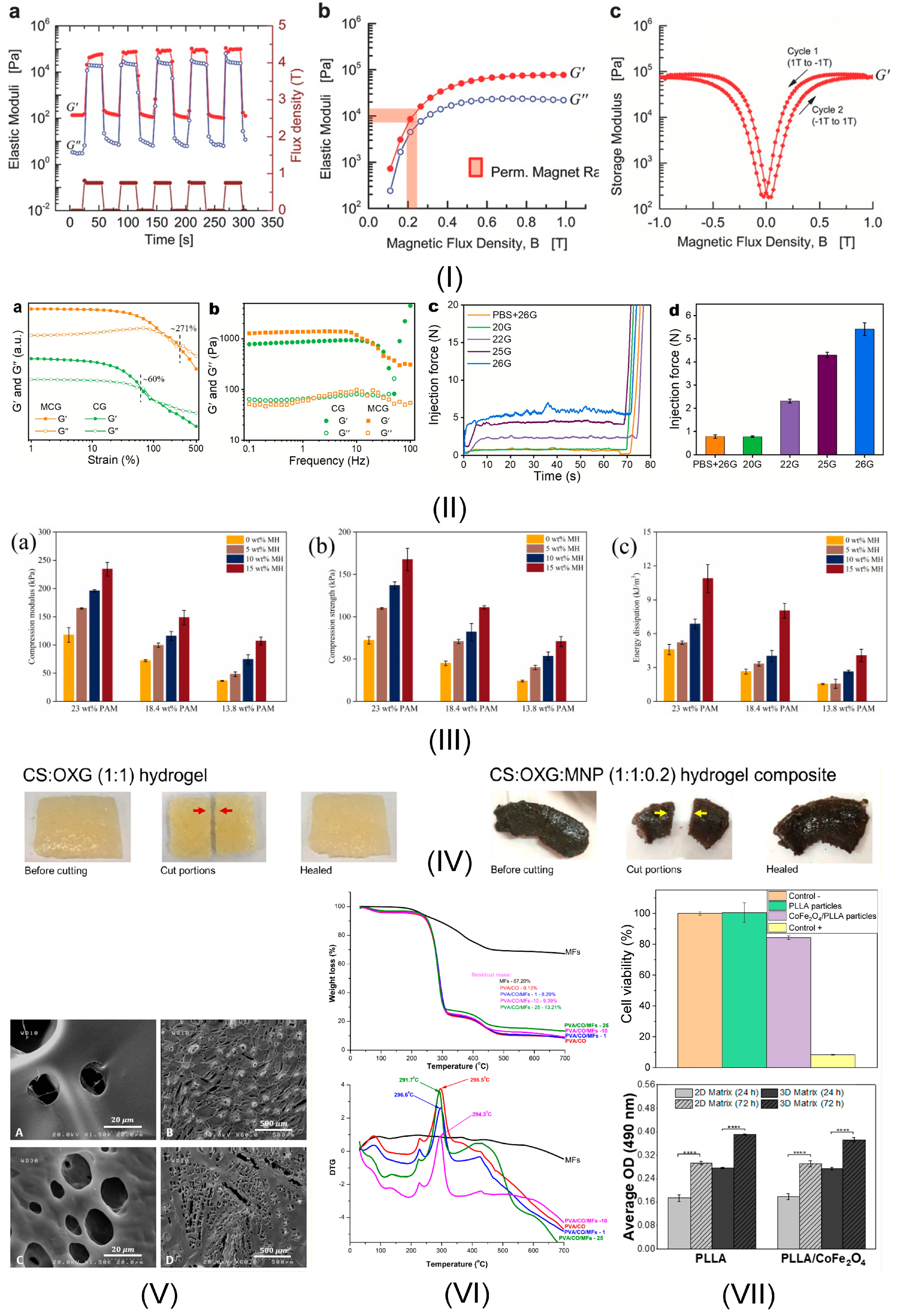 | Polyacrylamide with carbonyl iron | Secretions of proangionenic molecules and dynamic control of osteogenesis. Possible application in cancer therapy after tumor surgery to regenerate the operatory site | In vitro: Mesenchymal stem cells (MSCs) | - | Shear rheometry was involved in analyzing the MG’s mechanical properties under magnetic field action | Mechanical properties: 1 min. cycle testing condition: 30 s at 0 T and 30 s at 0.75 T. G′ at 0 T ranged between 0.1 and 0.14 kPa, and at 0.75 T reached 60 ÷ 90 kPa. The gel recovered its elastic modulus at 0 T with each cycle | Abdeen et al. [94] | |