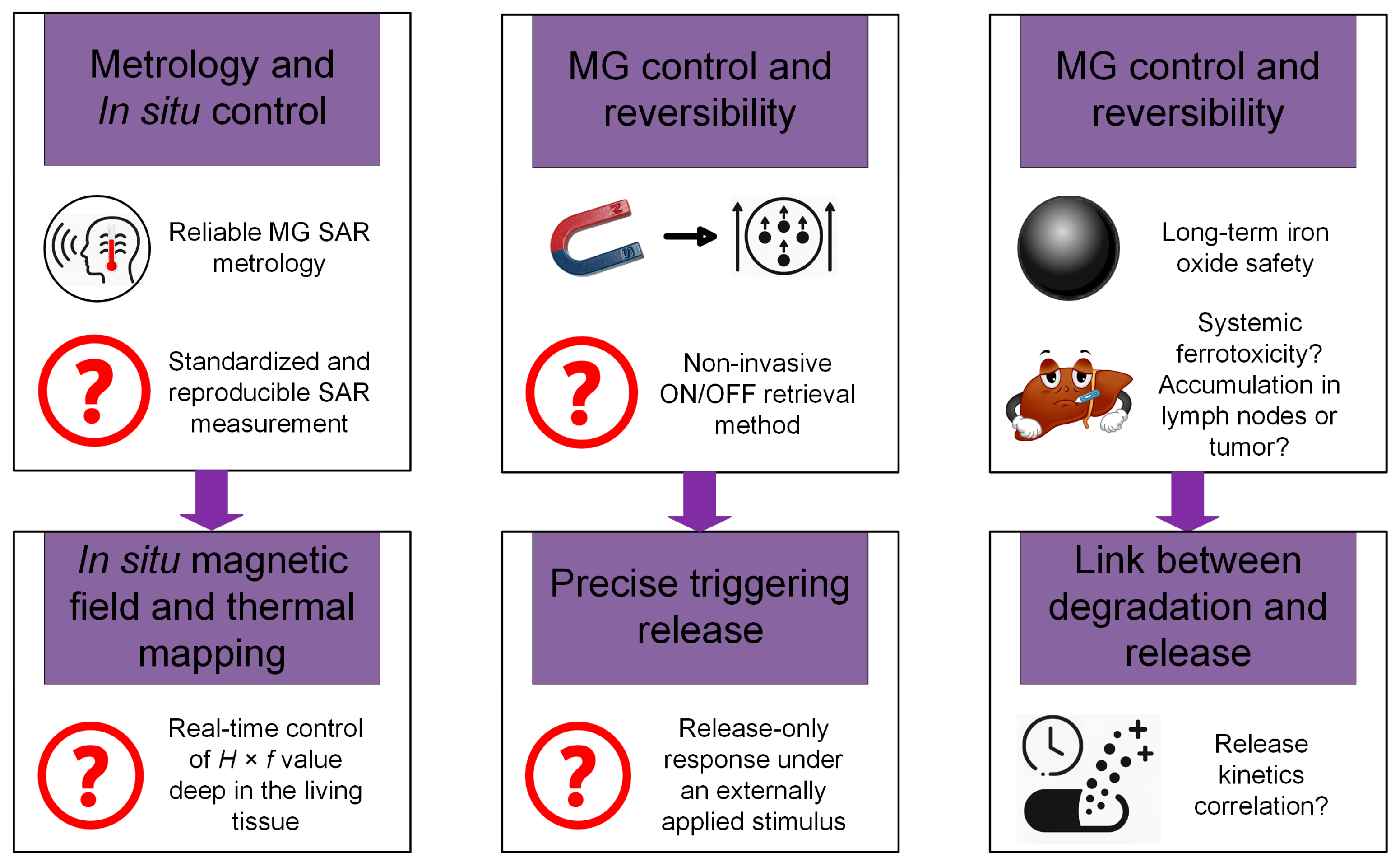| In vivo tests | MHT: good hyperthermia effects and possible chemoembolization; Drug delivery: improved drug delivery process and controlled release; Immunotherapy: good potential even in the absence of an external AMF | MHT: potential toxicity; Drug delivery: difficulty in drug release control; Immunotherapy: increased costs and unexpected immune reactions | The in vivo tests for MHT showed promising potential for cancer cell death, but the risks of some cellular damage must be considered in relation to MNP toxicity. When localized drug delivery is involved, reduced systemic side effects are achieved, but precise drug release control could be hard to conduct. Regarding immunotherapy, unexpected immune reactions may occur alongside MNPs’ toxicity. |