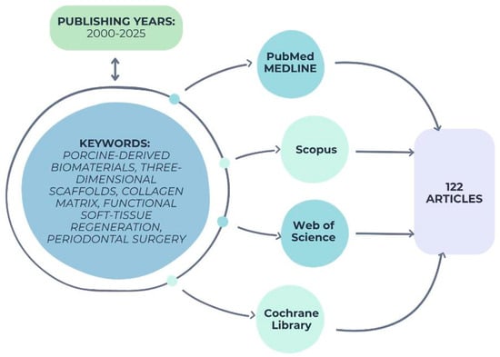 The evidence discussed herein originates from peer-reviewed publications retrieved from major biomedical databases, including PubMed/MEDLINE, Scopus, Web of Science, and the Cochrane Library. Relevant studies published between 2000 and 2025 were considered to capture both foundational and emerging concepts in porcine extracellular matrix (ECM) applications. The following keywords and Boolean operators were used: (“porcine” OR “xenogeneic”) AND (“collagen matrix” OR “extracellular matrix” OR “ECM” OR “SIS” OR “acellular dermal matrix”) AND (“periodontal regeneration” OR “guided tissue regeneration” OR “soft tissue augmentation” OR “gingival recession” OR “peri-implant”. Manual cross-referencing of cited literature within key papers was performed to ensure inclusion of landmark studies and significant clinical trials, as in Figure 1 below: