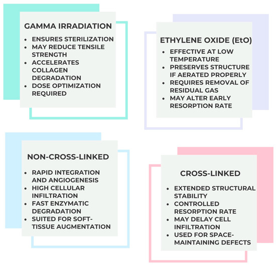 The selection of processing parameters is therefore tailored to the intended clinical application, balancing resorption dynamics with the regenerative requirements of the target defect. Figure 3 schematically summarizes sterilization pathways applied to porcine-derived scaffolds, emphasizing the trade-off between microbial inactivation and structural damage. In periodontal regeneration, maintaining collagen fibrillar architecture during sterilization is critical to prevent early membrane degradation and to support angiogenesis.