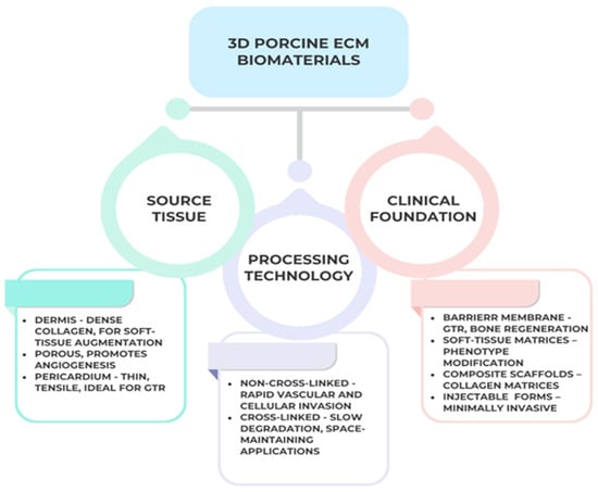 The classification of porcine-derived three-dimensional (3D) biomaterials used in periodontal regeneration is primarily based on source tissue, processing technology, and intended clinical function. Each category exhibits distinct physicochemical and biological characteristics that determine its suitability for specific regenerative applications. According to source tissue, porcine ECM scaffolds originate mainly from dermis, small intestinal submucosa (SIS), or pericardium [55].