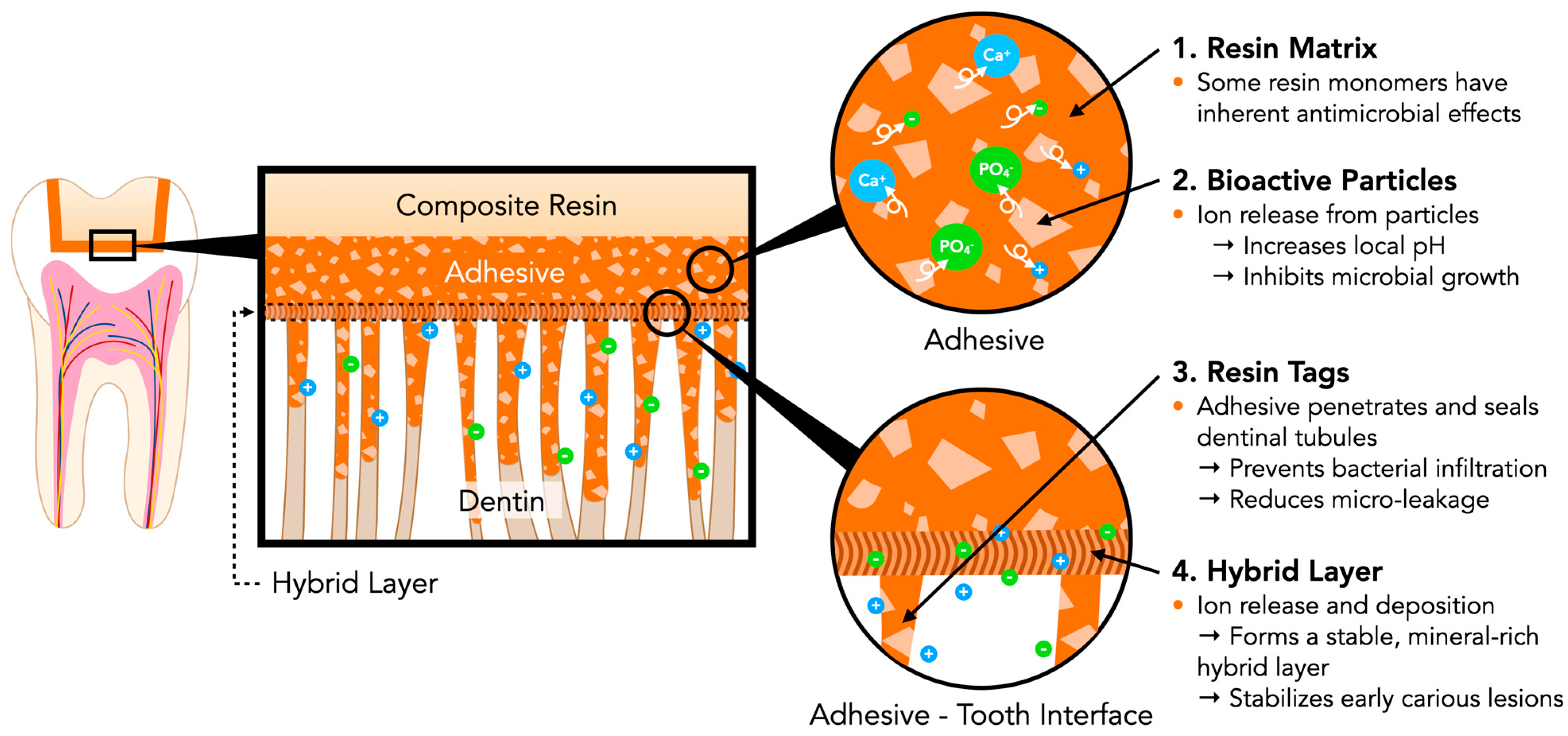 Bioactive dental adhesives offer a multifaceted approach to caries prevention, combining robust mechanical adhesion with biologically active defense mechanisms. These materials interact actively with the oral environment, promoting remineralization, resisting microbial colonization, and stabilizing the adhesive–tooth interface. A key mechanism is the controlled release of therapeutic ions, primarily calcium, phosphate, and fluoride, which supports the remineralization of demineralized enamel and dentin and enhances the formation of fluorapatite, a more acid-resistant mineral than natural hydroxyapatite. Self-etching adhesives modify or remove the smear layer before sealing dentinal tubules, enhancing adhesive penetration, reducing bacterial contamination, and improving bonding efficacy. This sealing also reduces postoperative sensitivity and prevents bacterial ingress into the pulp [19,20,21].