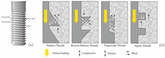 Characteristics of implant thread parameters. (a) Face angle: the angle between the threaded surface and the perpendicular line to the long axis of the implant. Pitch: The distance from the center of one thread to the center of the next along the longitudinal axis of the implant, divided by the number of threads. Thread depth: The distance between the outer contour of the thread and the base of the implant. Thread width: The distance between the crest (top) and the crest (top) of the same thread; (b) When the implant is subjected to vertical loading, the stress conditions at the implant–bone interface for four different thread forms (Mod according to [,]).