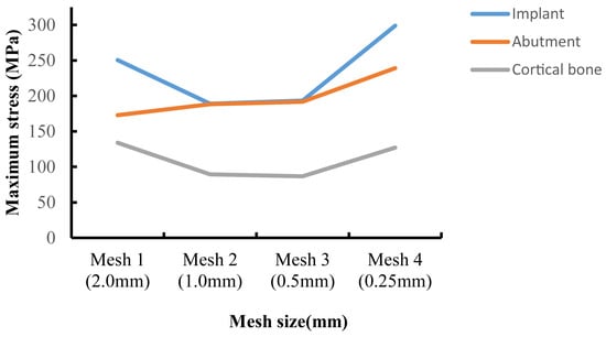 Validating the finite element model constitutes a pivotal phase in FEA, with model accuracy serving as a critical parameter for assessing its predictive capability. Prior research has demonstrated that within the finite element domain, achieving comparatively reliable experimental outcomes is generally attainable when the model’s element and node count ranges between 30,000 and 200,000 [,]. However, this standard has significant limitations—for example, when using a larger mesh size for large-scale models, it may still result in a high number of elements and nodes. In contrast, employing mesh convergence analysis is a more reliable and objective validation method: by progressively refining the mesh until the stress variation rate of the implant-surrounding bone tissue falls below 5%, while simultaneously monitoring the color gradient changes in adjacent elements (with a focus on stress concentration areas). If the color difference between adjacent elements (especially in stress concentration zones) exceeds one color level, it indicates that the current meshing scheme is unreasonable [,]. In this study, the initial mesh size of each finite element component was set to 2 mm. The initial mesh size was progressively halved, and local mesh refinement was applied to stress concentration areas to enhance mesh quality. Figure 3 presents the mesh convergence curve for M8, indicating that when the mesh sizes of the abutment, implant, and cortical bone were refined to 0.25 mm, the error in the von Mises stress results exceeded 5%. Table 1 provides a detailed list of the final mesh size parameters for each component in this study.