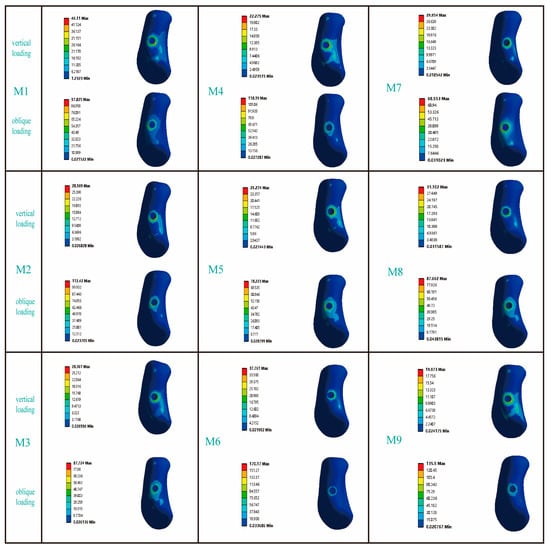In this study, all materials were assumed to be linear, elastic, homogeneous, and isotropic. Table 1 summarizes the material properties of the model components [,,,,]. About the contact conditions, it was assumed that the interfaces between cortical bone and cancellous bone, as well as between bone and implants, were perfectly bonded to simulate ideal osseointegration; all other contact surfaces were also set to be bonded. After tetrahedral meshing, the total number of elements and nodes for models M1 to M9 are summarized in Table 2. To simulate clinically common functional loads, the study replicated two loading conditions: one involved applying a vertical load of 100 N (along the long axis of the implant) on the crown, and the other involved applying an oblique load of 100 N (angled 30 degrees toward the lingual side relative to the long axis of the implants) [,]. The specific loading site on the top of the crown is shown in Figure 2e. Finally, both sides of the mandibular bone block were fully fixed (restricting displacement in the x/y/z directions), with horizontal movement restricted on all four sides (only allowing minimal vertical micromovement).