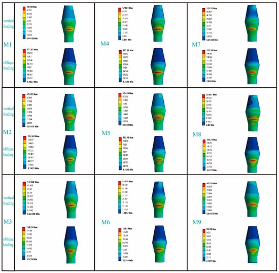 The equivalent elastic strain value of the jawbone is an important observation indicator in finite element experiments. Previous studies have shown that when the maximum elastic strain value of the jawbone exceeds 6.7 × 103 με, an imbalance in the bone remodeling process around the implant will occur []. Table 3 presents the strain distributions in the cortical bone for all models. Under vertical loading, the strain values of all models were less than 6.7 × 103 με, while under oblique loading, only M7 exhibited a maximum equivalent elastic strain value of 5.05 × 103 ε (which is less than 6.7 × 103 με). Table 4 summarizes the strain values of all implants under both vertical and oblique loading. According to previous studies, when the minimum and maximum equivalent elastic strain values of an implant fall within the range of 0.0015 to 0.0030 (mm/mm), it provides a favorable environment for bone growth []. Our findings indicated that in this study, the maximum equivalent elastic strain values of the implants across all models remained below 0.0030 (mm/mm).