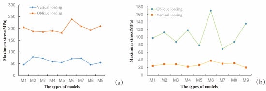 Maximum von Mises stress values for each model. (a) Stress in the implant; (b) Stress in the cortical bone surrounding the implant.