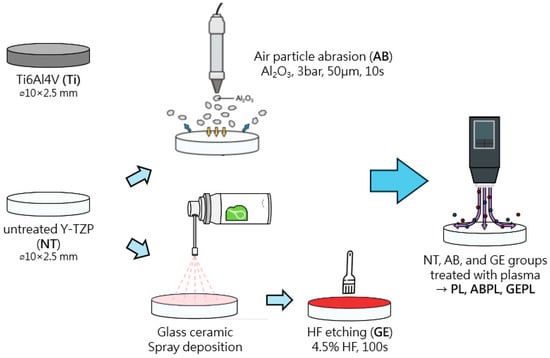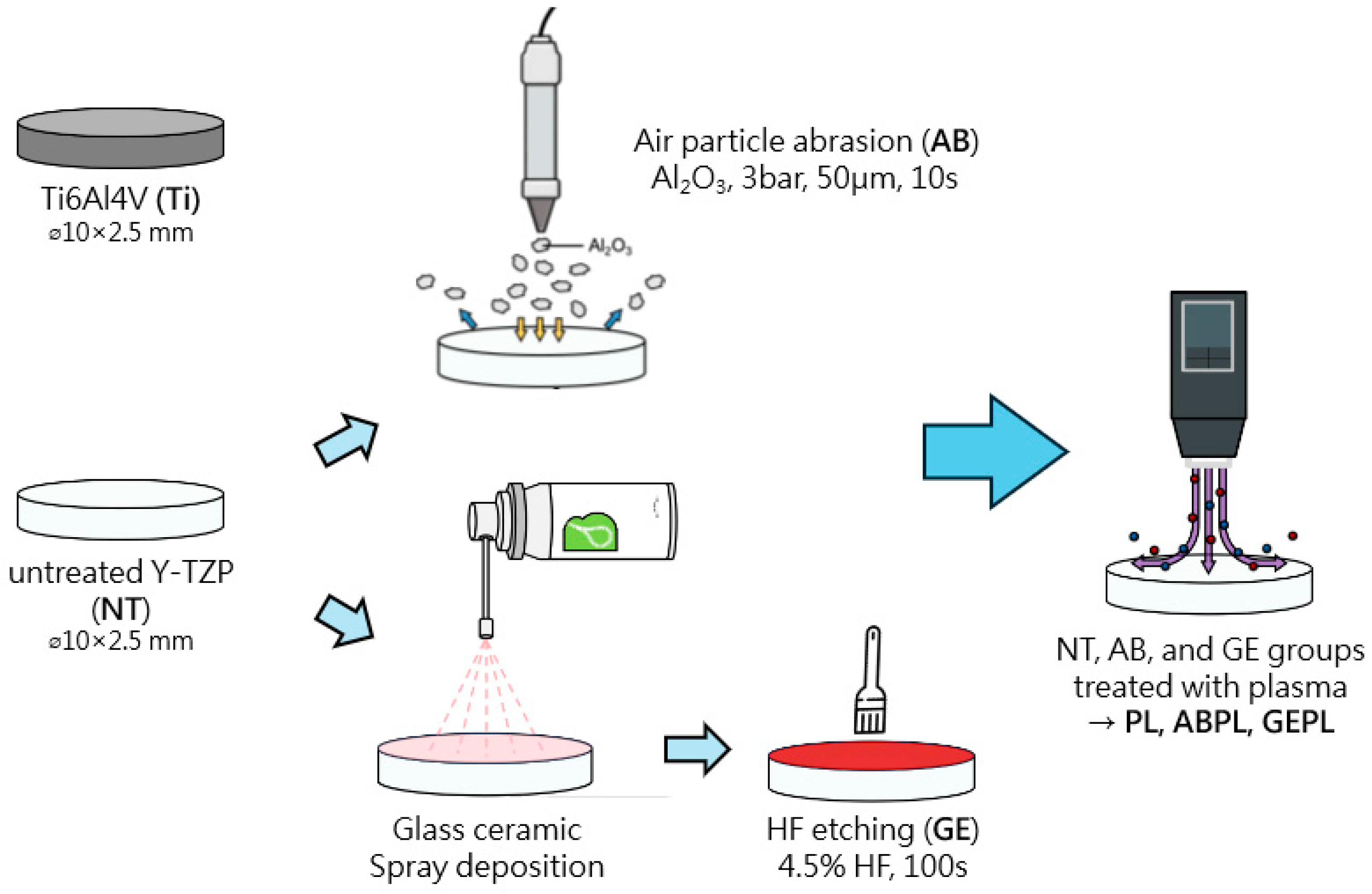 - Lee, S.K.; Ji, M.K.; Jo, Y.J.; Park, C.; Cho, H.; Lim, H.P. Effect of Non-Thermal Plasma Treatment of Contaminated Zirconia Surface on Porphyromonas gingivalis Adhesion and Osteoblast Viability. Materials 2022, 15, 5348. [Google Scholar] [CrossRef]